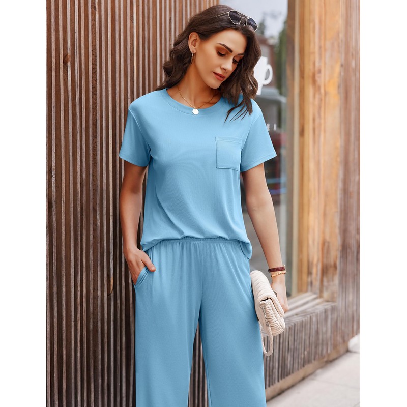 Ekouaer Womens Ribbed Knit Lounge Set Short Sleeve Top and Long Pants Soft Pajama Set 2 Piece Sleepwear with Pockets Light Blue Medium