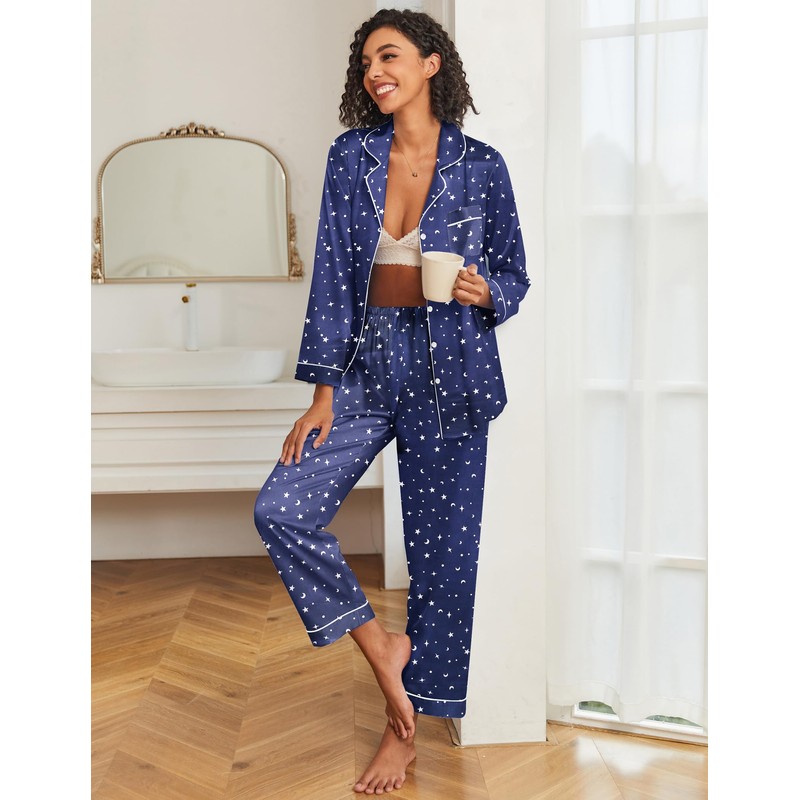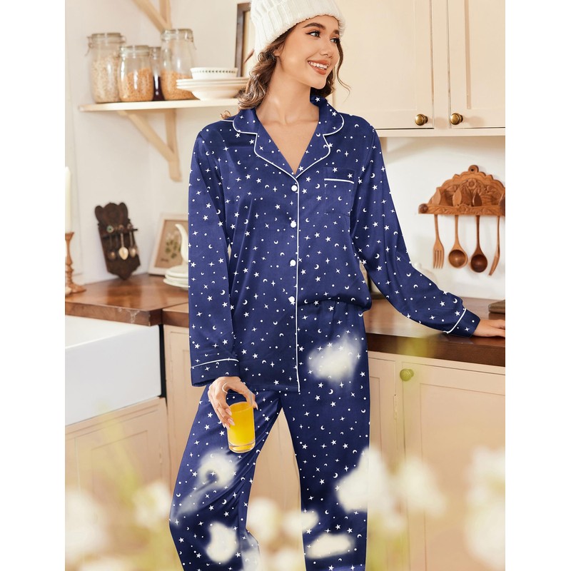 Ekouaer Womens Satin Pajama Set Classic Pattern Silky Pj Sets Button Down Sleepwear Loungewear,XX-Large,Blue Star Moon