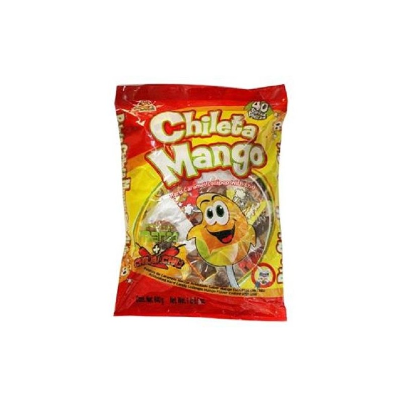 - CHILETAS – Acidulated hard candy lollipops. Each bag includes 40 individually wrapped lollipops.