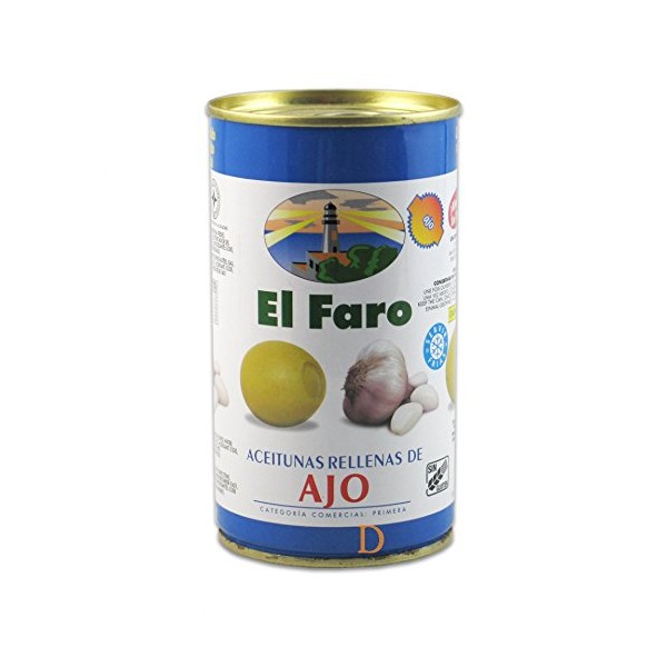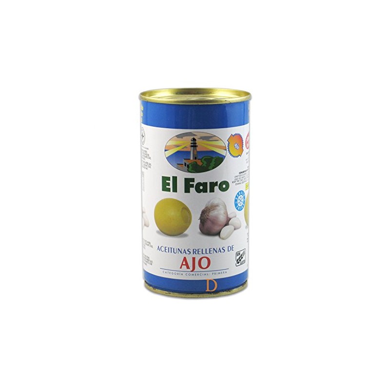 Filled olives with garlic 150 g. Ideal snack for between filled with a piece of cheese and bread. Olives filled with garlic. Ingredients: green Manzanilla olives without stone, water, salt, 6% garlic, flavour enhancer: E621, acidifier: E330, E270, antioxidant: E300, stabilizer: E401. After opening, store in the fridge and use within 6 days. Made in Spain.