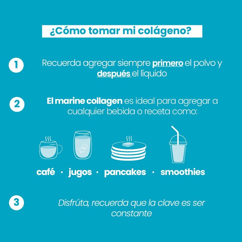 - 🌊USO | Lo puedes tomar a cualquier hora del día, en tu café, té, smoothie, jugo ó agregar a tu receta favorita.
