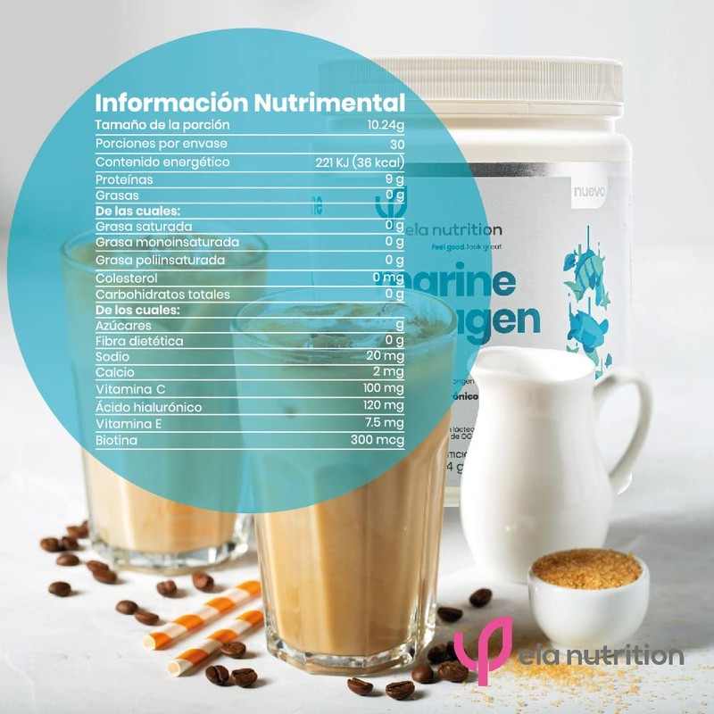 ela nutrition | Marine Collagen | Péptidos bioactivos de colágeno hidrolizado marino + ácido hialurónico + biotina + vitamina C + vitamina E | 334 gr (33 porciones)