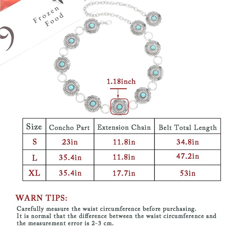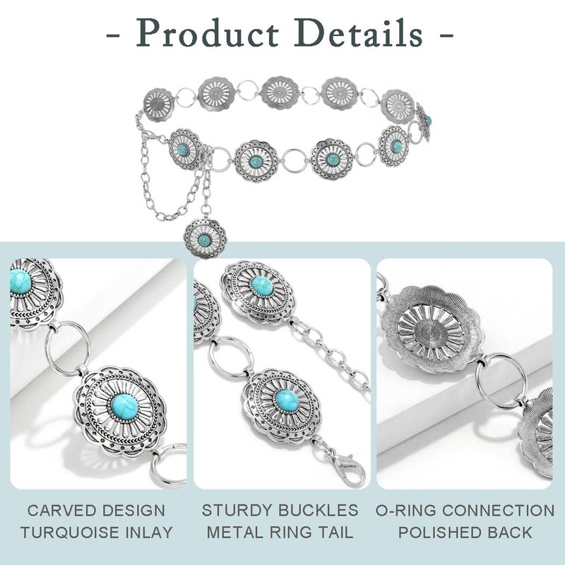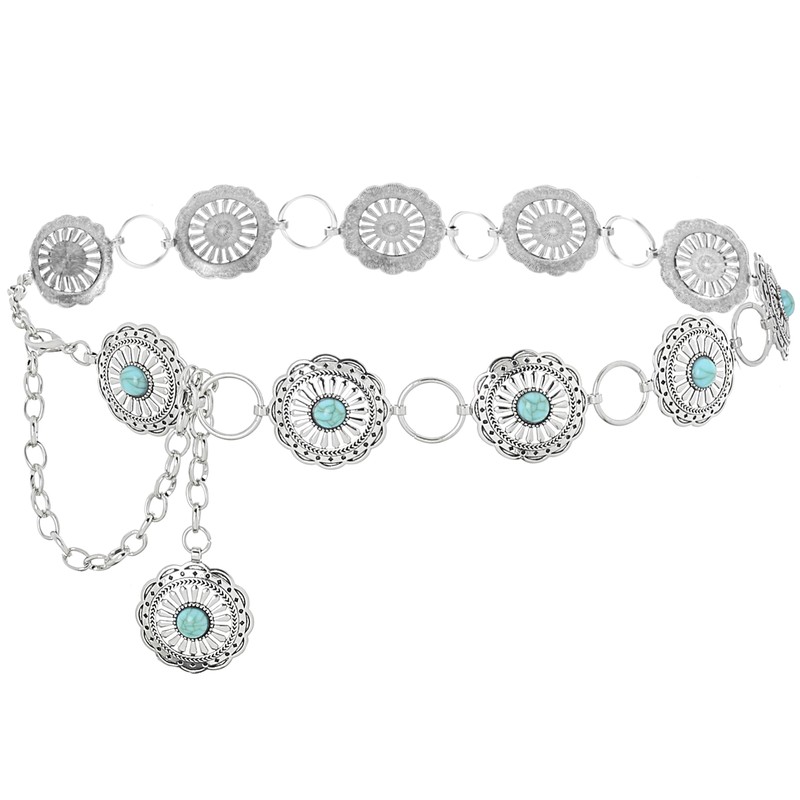 ELABEST Turquoise Chain Belt Silver Concho Belt Cowgirl Cowboy Western Waist Chain for Women and Men