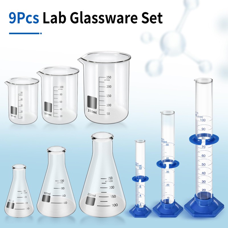 - Product List: Includes 3 Pcs Glass Measuring Beaker: 50/100/250 ml, 3 Pcs Glass Flask: 50/100/250 ml, 3 Pcs Graduated Cylinder: 10/50/100ml. Providing versatile tools for different activities