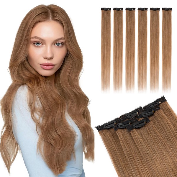 Elailite Real Hair Extensions Clip In Human Hair Remy Brown Double Weft 6 Pcs Seamless Highlights Hairpieces Straight - #06 Light Brown - 18 Inch 44g