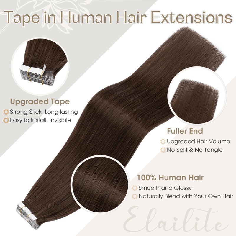Elailite Tape in Hair Extensions Human Hair Real Human Hair 10 Pcs Invisible Thin Type - Seamless Skin Weft Remy Hair Extension (#4 Medium Brown, 12 Inch-10g)