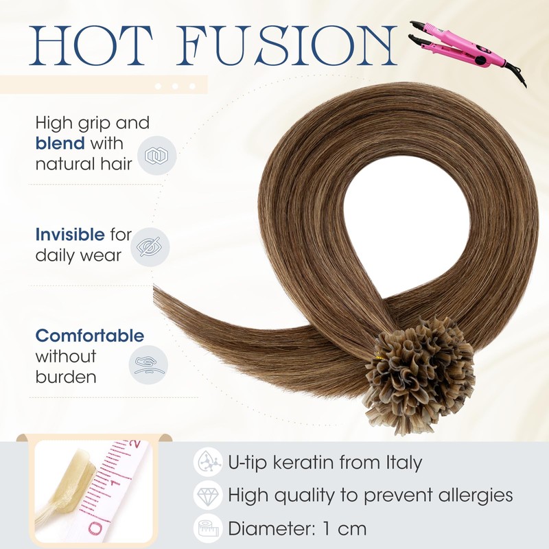 - 100% human hair + mild hair extension keratin glue in U-shape. Provides long-lasting adhesion and the most invisible hair extension without damaging your own hair and scalp. Top quality at an affordable price!