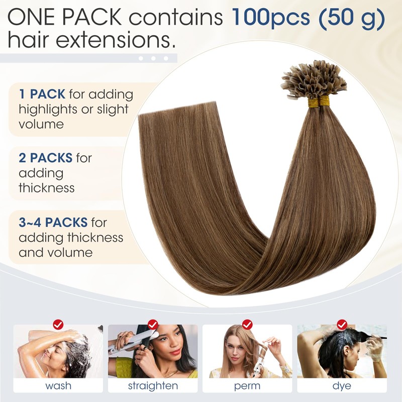 - 💎 Package includes: 100 pieces per pack, 0.5 g/piece. As each hair weighs only 0.5g, it looks thinner. Total hair weight 50 g, smooth structure. For full hair extensions, you need about 2-4 packs. Take these extensions off after 3-6 months.