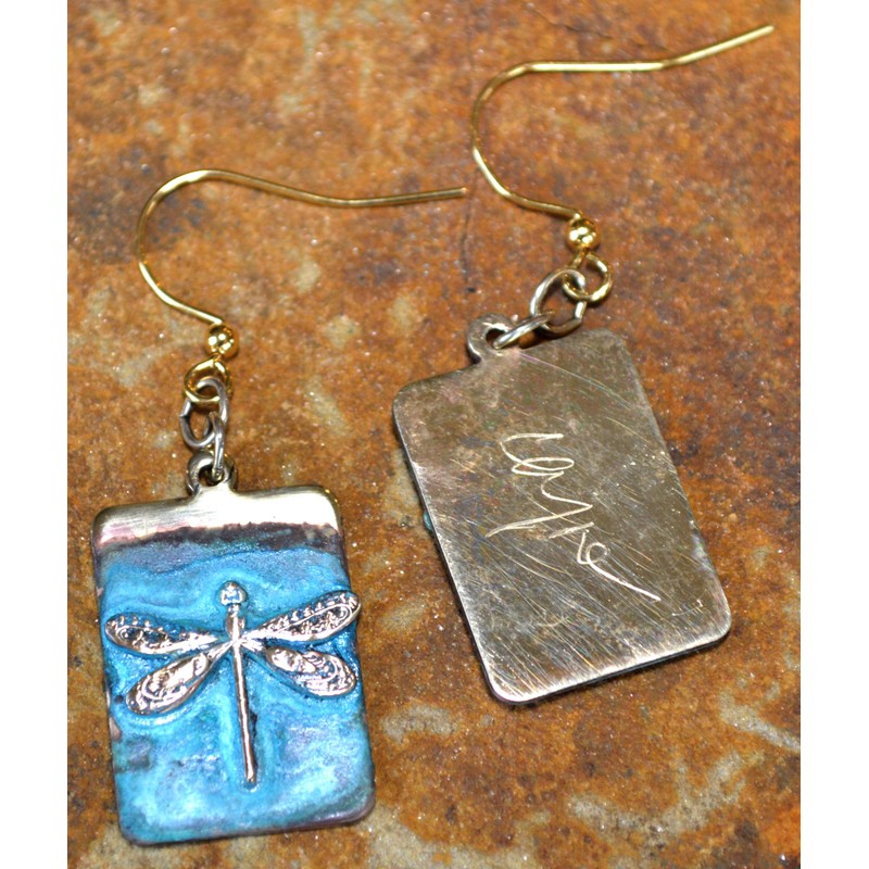 - Verdigris Patina Solid Brass Dragonfly on Rectangle Dangle Earrings Includes Artist's Statement and Designer Velvet Pouch with Trademark Tag.