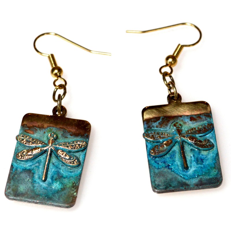 - Verdigris Patina Solid Brass Dragonfly on Rectangle Dangle Earrings Made in the USA