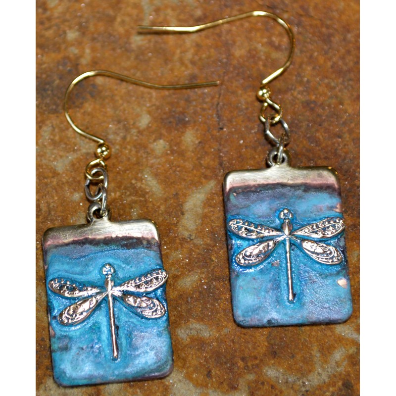 Elaine Coyne Wearable Art Verdigris Patina Solid Brass Dragonfly on Rectangle Dangle Earrings