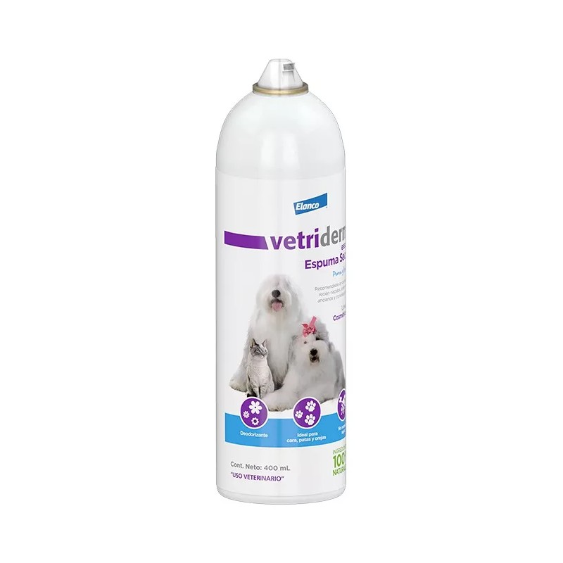 Vetriderm® actúa como un coadyuvante en problemas dermatológicos, ejerciendo un efecto terapéutico en la piel y el pelaje de la mascota. Se recomienda leer los detalles en la etiqueta del producto.