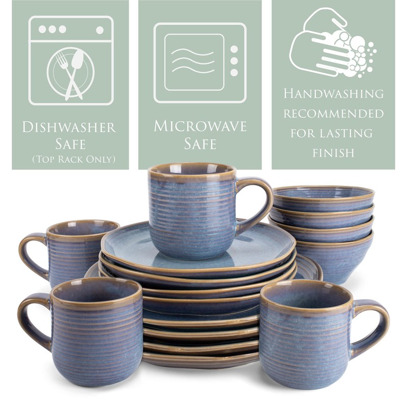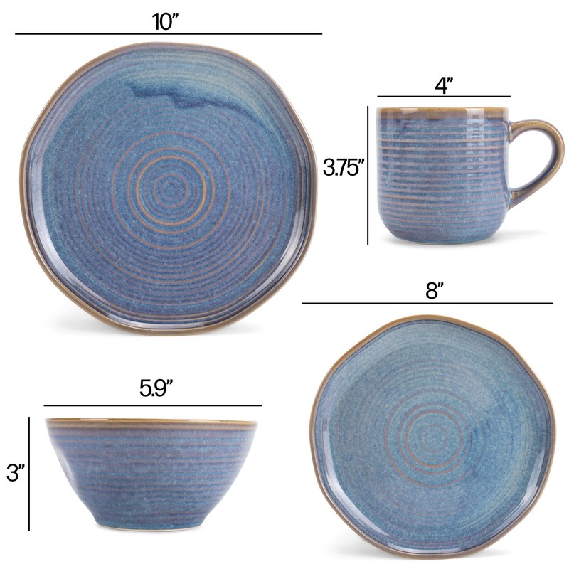 - 16 PIECE SET - Each service includes 1 dinner plate, 1 salad plate, 1 bowl, and 1 mug; Dinner plate measures approximately 10 inches in diameter, Salad plate measures approximately 8 inches in diameter, Bowl measures approximately 5.9 inches across and holds approximately 18 fluid ounces, Mug holds approximately 17 fluid ounces