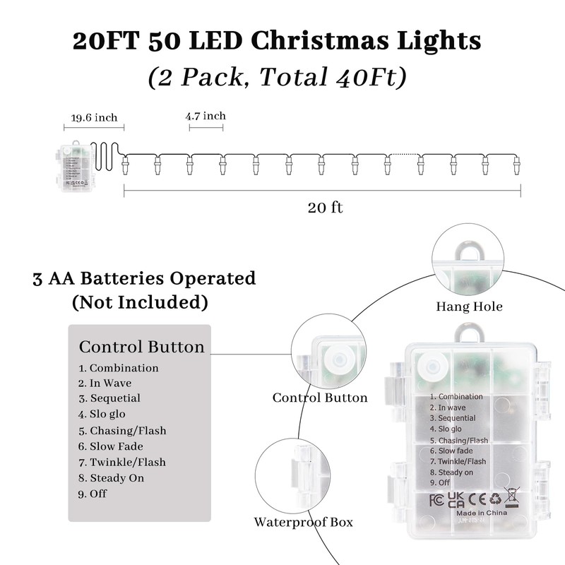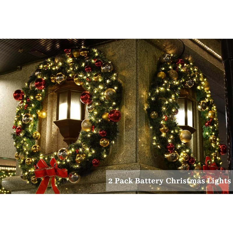 - [ 2 Pack Battery Powered Christmas Lights ] Each 20ft string light has 19.6 inch leading wire, and powered by 3 AA batteries (Not included), no extra cord or socket required, more convenient to be wrapped or hung on Christmas tree, wreath, window, garland and anywhere for decoration