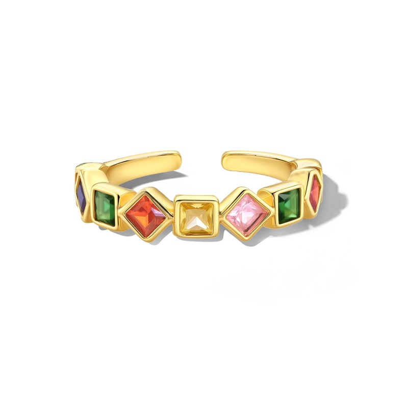 - [Rainbow Design] Adorned with a spectrum of square cut cubic zirconia (CZ) stones in red, yellow, green, blue, and pink, this rings for women creates a dazzling rainbow effect. Set in a 14K gold plated band, it's a perfect blend of style and color, making it an instant attention grabber for those who love unique jewelry