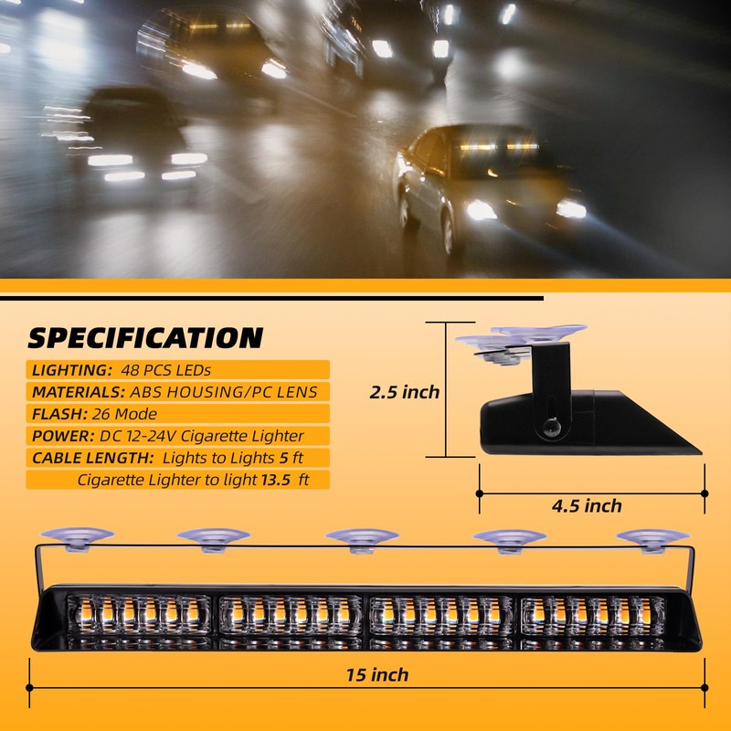 - FEATURE - This LED windshield strobe light features 48 high-powered LEDs that illuminate brightly during the day and at nighttime. The unique integrated shroud design prevents dizziness caused by light exposure during driving. LED Lifespan up to 50,000 Hours