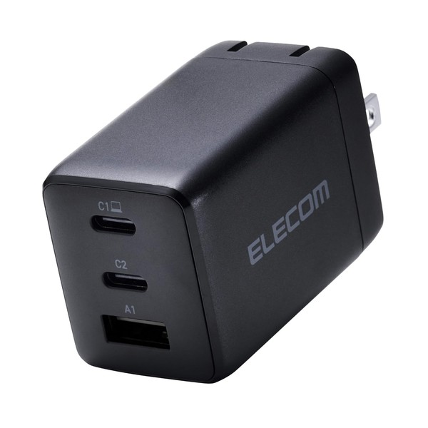 Elecom ACDC-PD10367BK Charger, 67 W, 3 Ports, USB-C x 2, USB-A x 1, USB PD Compatible, Swing Plug, Black
