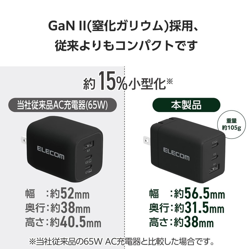 - Uses GaN II (Galium Nitride) for a compact size while maintaining high output. The plug part can also be folded, so it does not take up much space in the bag, making it convenient for business outings, remote work, business trips, travel, etc