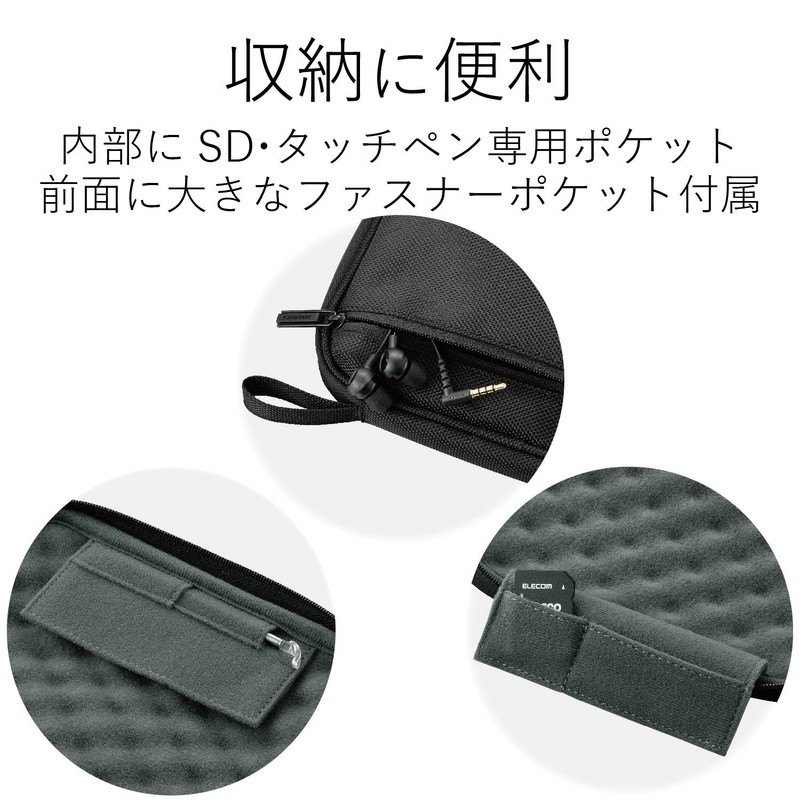 Zipper pocket on the front A large zipper pocket on the front of the case is provided for storing earphones and other small items. |