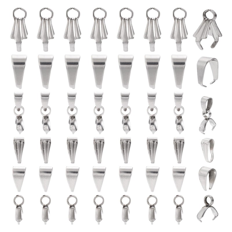 - Quantity and Size: You will get 60 pcs pinch bails in stainless steel color, each set contains 6 styles; size about 8-10 mm long, 3.5-7.5 mm wide, hole: 1.6-4 mm, these snap bail pinch bails are easy to attach and will securely hold your jewelry pieces in place
