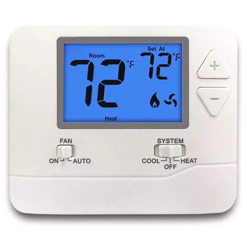 - Non-Programmable ThermostatNon-programmable electronic thermostat, single stage, 1 heating and 1 cooling, electric or gas/oil configurable. Not compatible with 110-240V electric heat systems (e.g. electric baseboard heat, line voltage, convectors, radiant-ceiling heat.