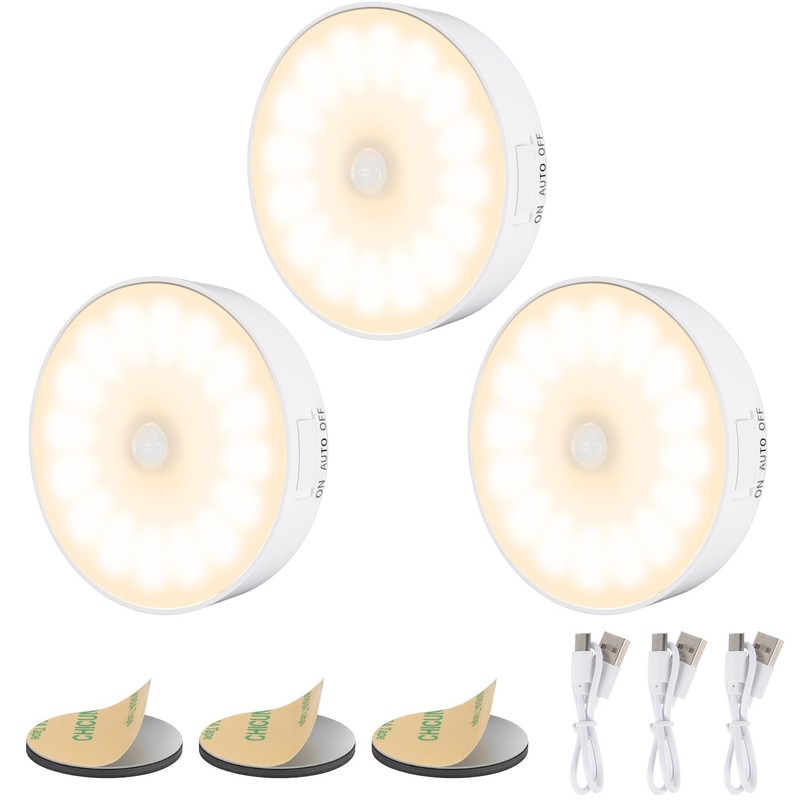 Electight 3 Pack Motion Sensor Light Indoor, Newest 14 LEDs Night Light USB Rechargeable, 3 Light Modes & Long Last Battery, Cordless Magnetic NightLight for Closet, Bedroom, Stairs - Warm White