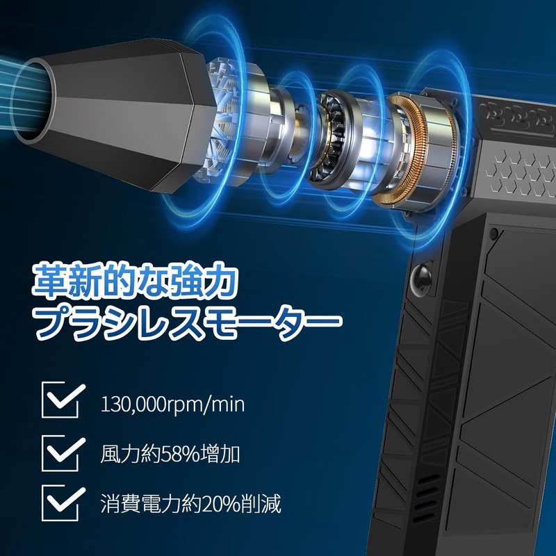 - Overwhelming Injection and Dust Retention: The electric air duster has a powerful wind speed of over 52m/s for an unprecedented breeze experience. Powerful air flow and excellent dust removal power instantly. Equipped with an advanced brushless motor with a maximum speed of 130,000 rpm, the wind and air flow is stable even after continuous use, and the energy consumption is reduced by 20%