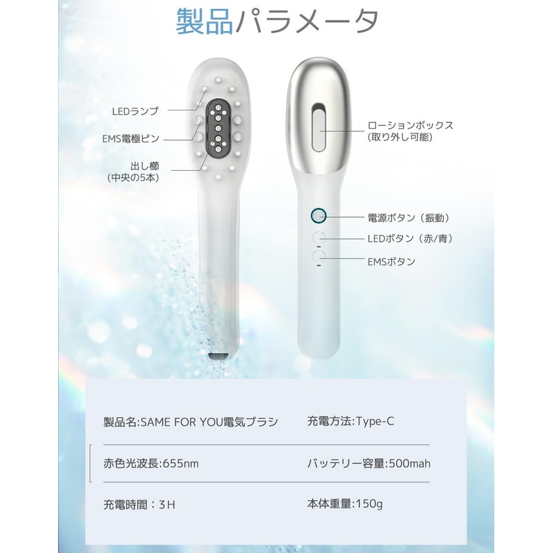 - (EMS lifts care for scalp with EMS) EMS provides a weak current to efficiently approach the scalp and skin to create an upward facial impression. The scalp connected to the whole body and one piece of leather is key to lift care. The electrode pins output EMS that adapt to the scalp to stimulate the muscles that are dotted to the head. In addition, the red/blue LED and micro current are also combined to gently care for the scalp that tends to become hard