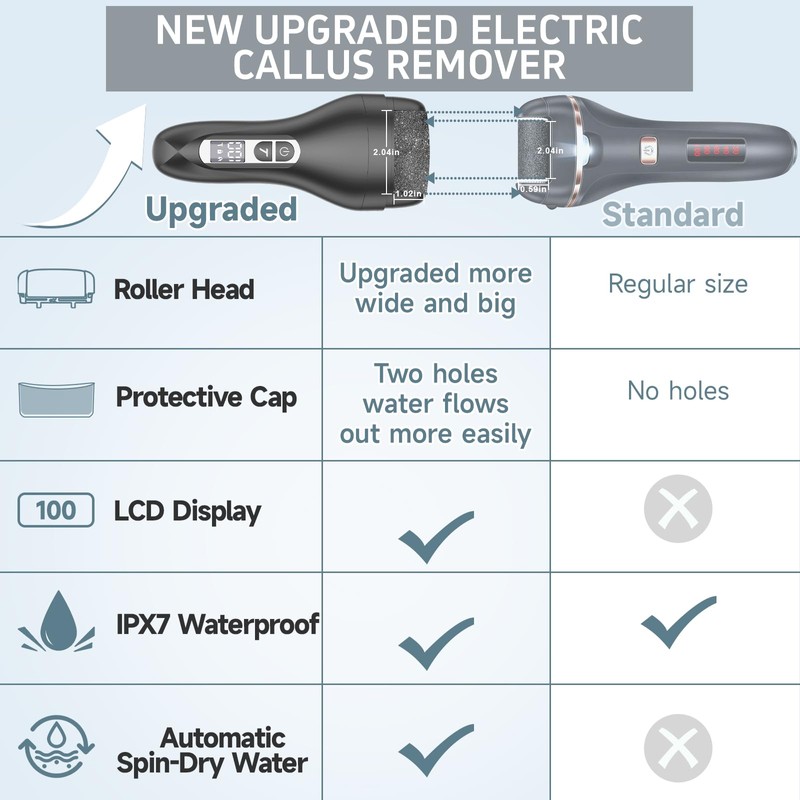 - 【Upgraded Electric Foot Callus Remover,More Powerful,Faster】 ━ New & Improved electric dead skin remover giving you 2x more power than other rechargeable brands. See for yourself, when you try it! It's portable, lightweight, and the perfect, travel-friendly gift set for both men and women.With this electric callous remover kit, you'll say good-bye to cracked heels and hello to your favorite sandals. Watch years of callused, dry, hard skin give way to baby-soft, smooth skin in minutes.