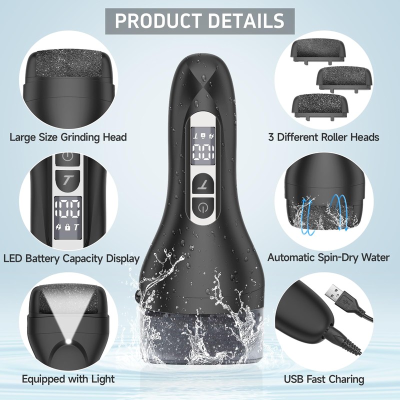 - 【Automatic Spin-Dry Water ,IPX7 Whole Body Waterproof,Easy to Clean】 ━ The electric foot grinder has automatic spin-dry water function,after cleaning, put in the dust cover to turn on the switch and start throwing water, this electronic foot scrubber can be automatically dried after cleaning.Callous removers for feet with high level IPX7 Waterproof for wet and dry use.The dead skin remover are easy to use and clean, is a thoughtful gift for your family, lovers and yourself.