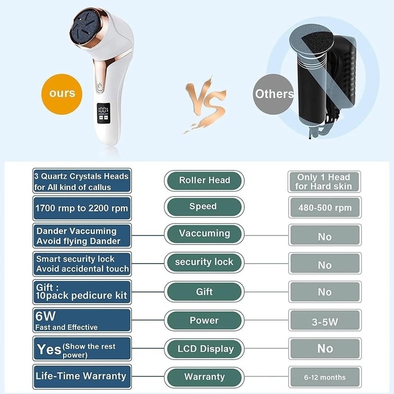 • Includes 3 interchangeable quartz roller heads for a complete pedicure experience, from foot file to callus remover electric functions.