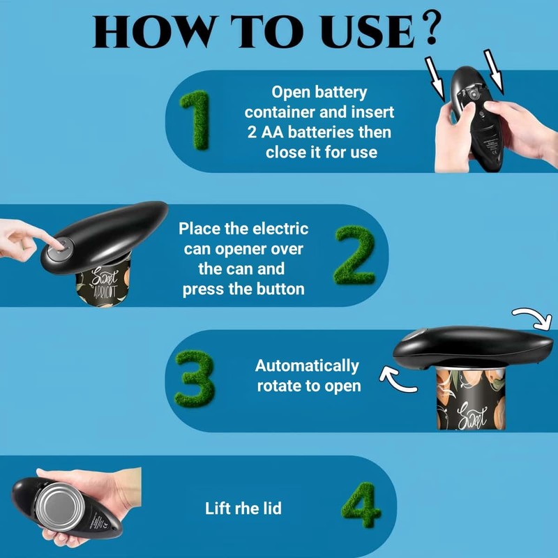 - 【Easy to Operate】Open almost any jar with our electric can opener. Touch the on/off button to start, wait for it to automatically cut the can 360° along the lid, and after running, press the button again to stop for a complete circle. You'll get a can that opens well and has clean, smooth edges. Very easy to clean with a damp cloth. (Note: It is recommended that when you first open the electric can opener, you can gently press the back to make the blade fit the can body, which is conducive to one-time success)