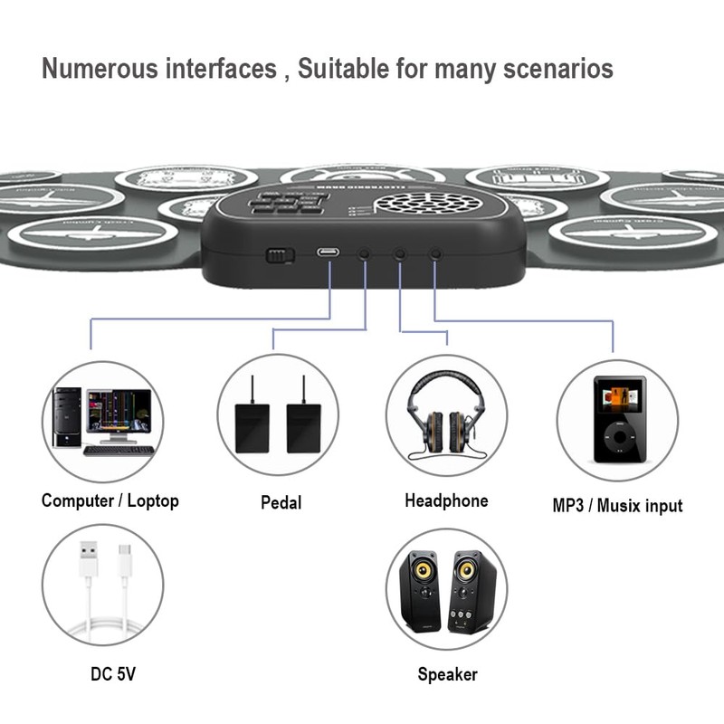 - Build-in Speakers and AUX Jack: electric drum pads featuring a high-quality speaker, that bring you astonishing bass effects,perfect drumset machine for outdoor performance. With audio output jack,you can connect drum sets with your phone to load more demos