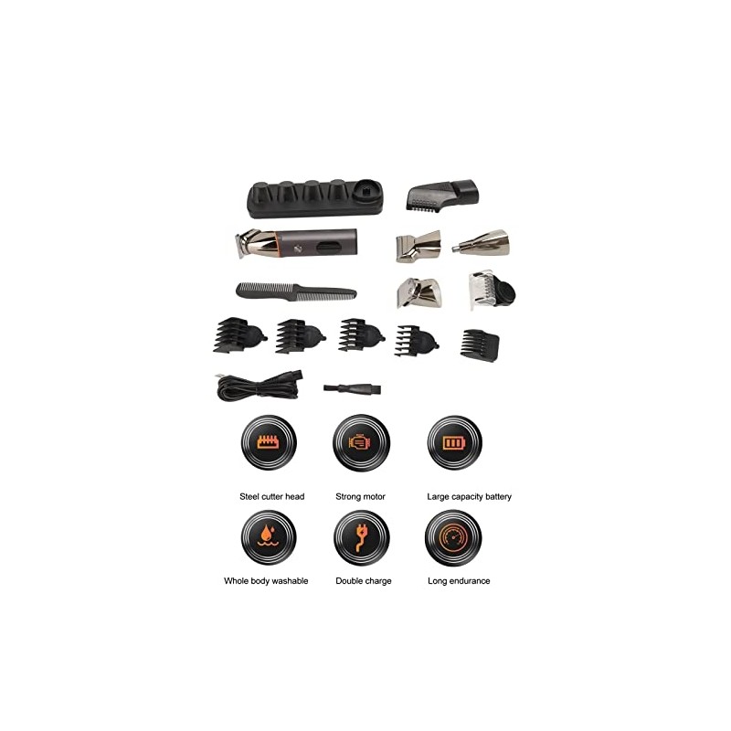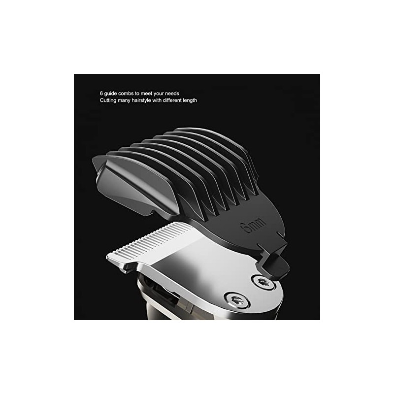 Spec:Item Type: Electric Hair ClipperMaterial: ABSBattery Type: Lithium Battery (Included)Battery Capacity: 600mAhPackage List:1 x Electric Hair Clipper1 x USB Charging Cable1 x Cleansing Brush1 x Manual6 x Guide Comb 1 x Storage Rack 1 x Nose Hair Cutter 1 x Beard Cutter 1 x Eyebrow Cutter 1 x Hair Cutter 1 x CombHow To Use:1. Press the switch button to turn on the electric clipper. 2. Move the electric clipper foil along the direction of beard growth on the skin, reciprocating in a straight line. The beard on your neck can also be removed off. 3. Before trimming, rinse with warm water to keep your hair dry. 4. For better results, if you need to cleanse the cutter head during the trimming process, please use a brush and cleanse the cutter head after the trimming is finished. 5. Once the trimming is complete, press the switch button again to turn off the electric clipper, then put the cover on to avoid damaging the foil.