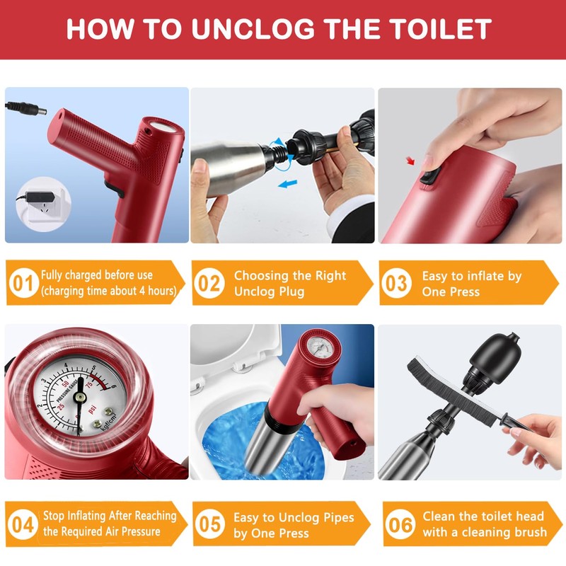 - Powerful Electric Toilet Drain Plunger: The high-pressure toilet plunger adopts a turbocharging principle to compress air into the air storage tank (maximum 120 PSI Bar) . Powerful air power that can quickly flush stubborn blockages in drainage toilets and pipe in just a few seconds. The drain clog remover set can handle hair, cloth, oil, grease, tea, leaves, etc in the sewer. More effective and faster than traditional plungers, sink snakes and toilet augers!