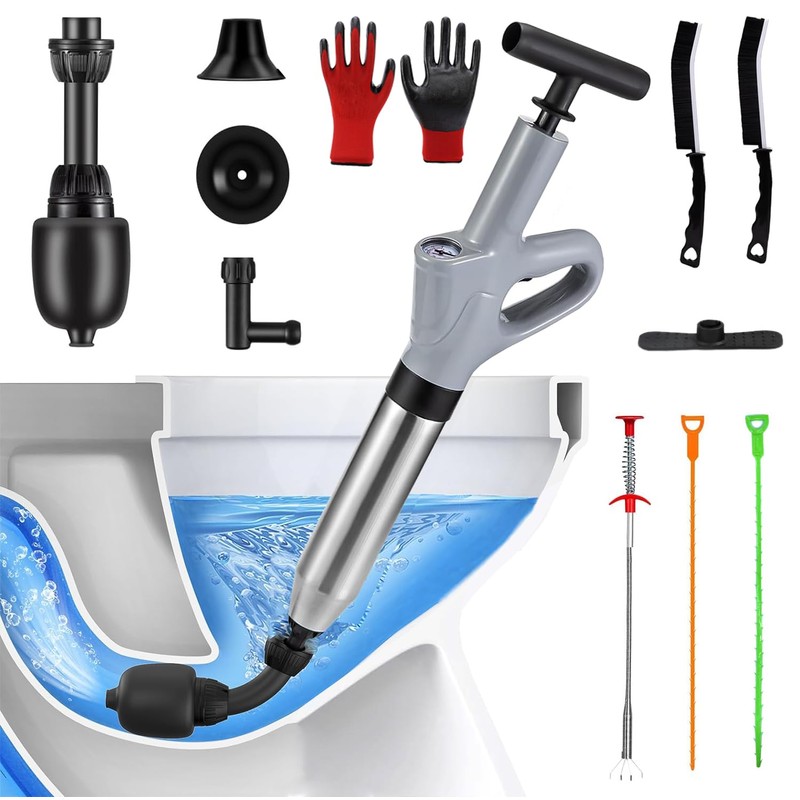 - Powerful Electric Toilet Drain Plunger: The high-pressure toilet plunger adopts a turbocharging principle to compress air into the air storage tank (maximum 120 PSI Bar) . Powerful air power that can quickly flush stubborn blockages in drainage toilets and pipe in just a few seconds. The drain clog remover set can handle hair, cloth, oil, grease, tea, leaves, etc in the sewer. More effective and faster than traditional plungers, sink snakes and toilet augers!