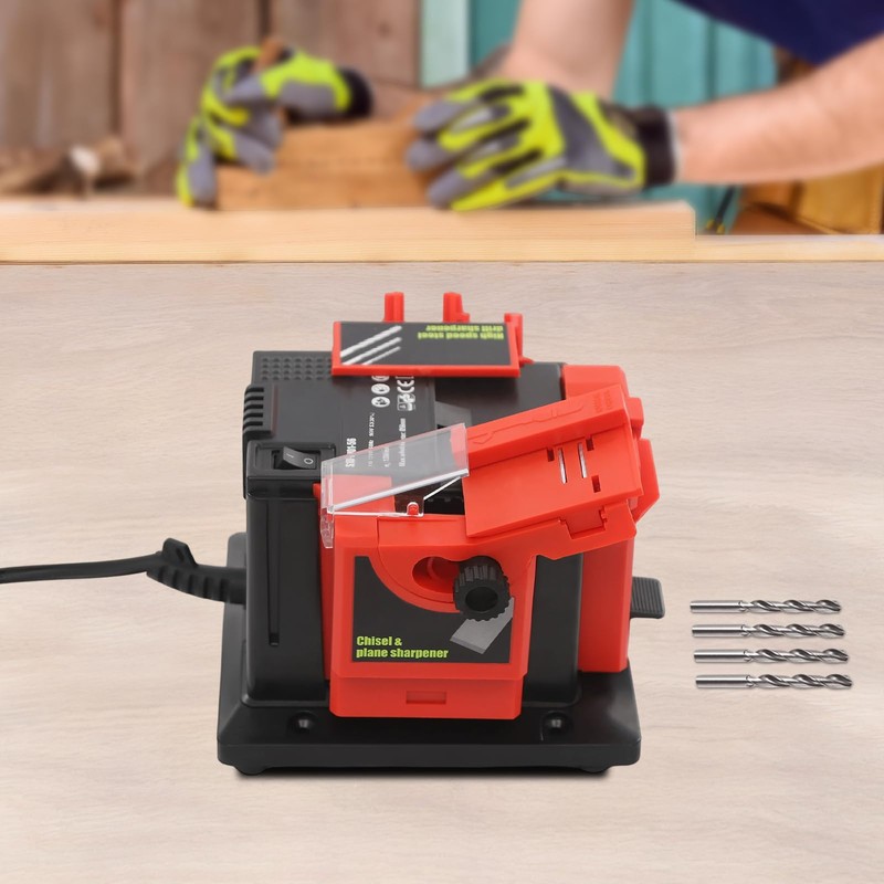 The product is carefully equipped with three high-efficiency sharpeners, which are customized for scissors, chisels, and drills, making it an indispensable and convenient tool for your daily use. The built-in powerful motor and 180-mesh precision grinding wheel ensure that every sharpening can achieve excellent results and satisfy your ultimate pursuit of sharpness. What's more, the simple machine operation greatly enhances the experience of using the machine.