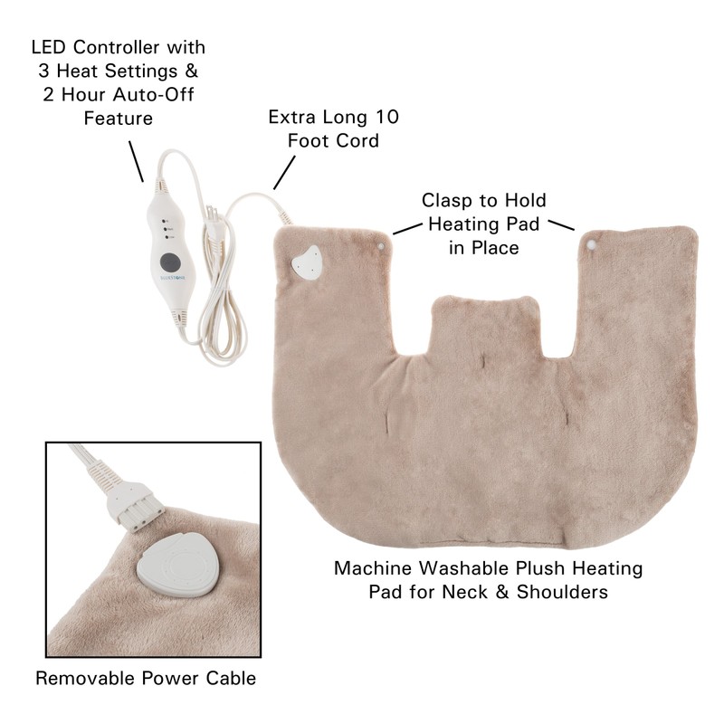 Electric Neck/Shoulder Warmer-Heating Pad with 3 Settings, Auto Shut Off, Front Clasp and Long Detachable Cord-Soft Plush Heat Pack by Bluestone (Tan)