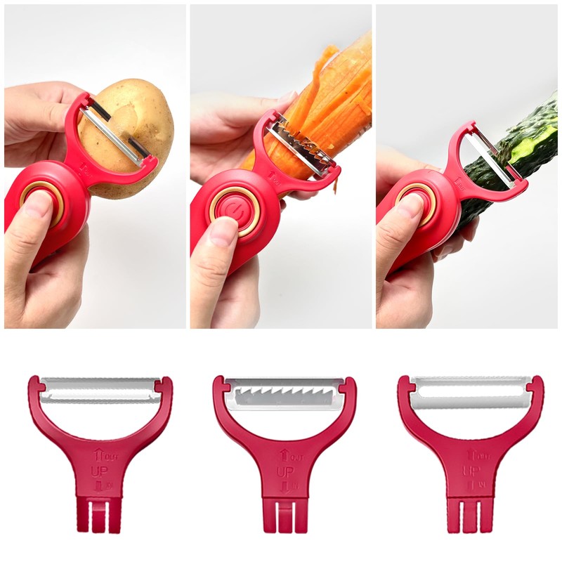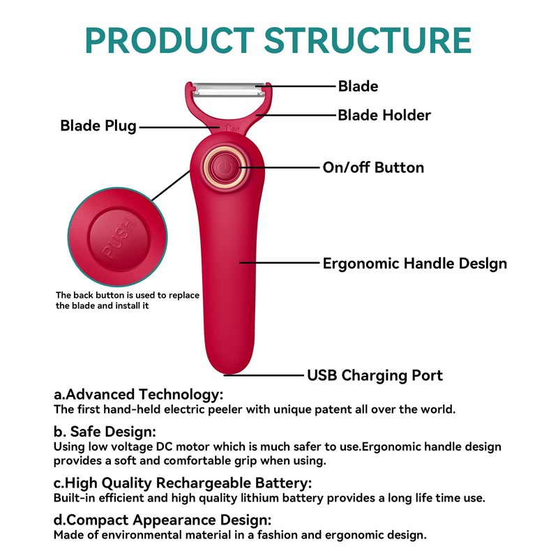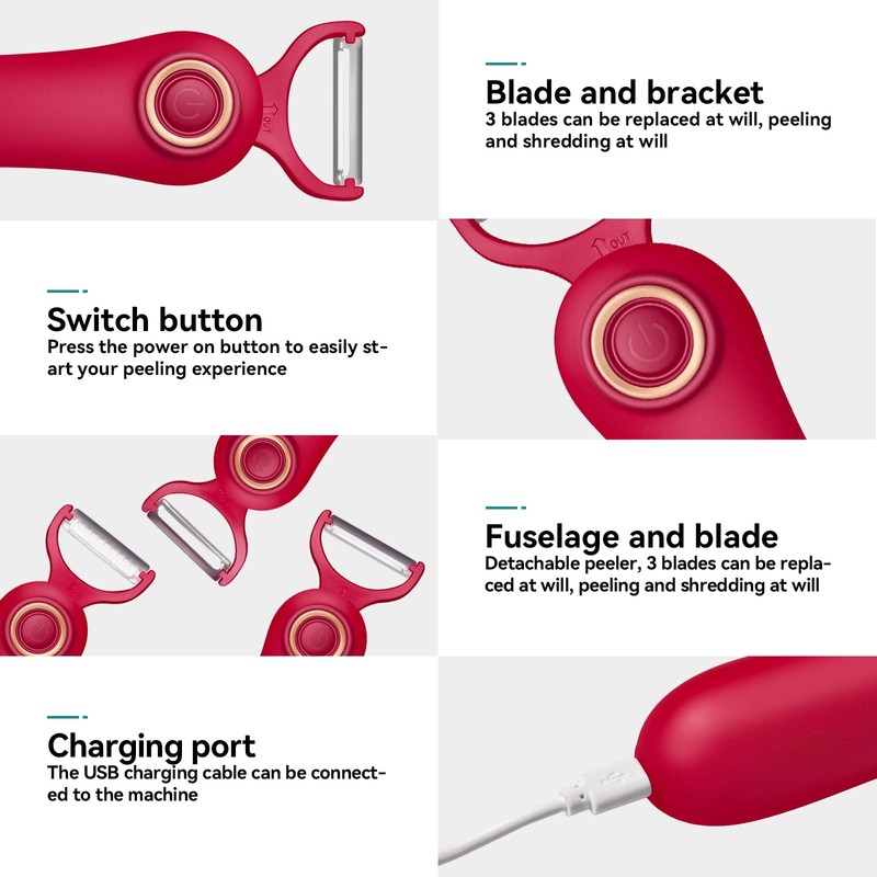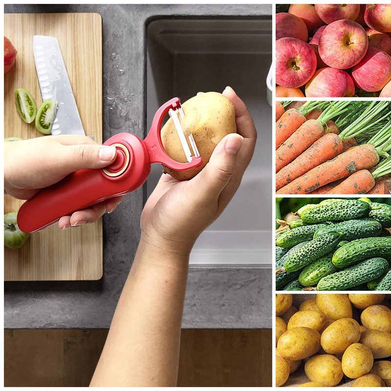 - Our electric potato peeler is very simple to use, just press the power button then you can peel almost all fruits and vegetables in seconds quickly and effectively, it saves your time and effort. 3 extra stainless steel sharp blades, easy to change and save your space. One-edge peeler used for peeling fruit and vegetable potato skin; Y-shaped peeler tend to peel fruits and vegetables in two-way; Julienne peeler will make julienne strips from vegetables, such as carrot.