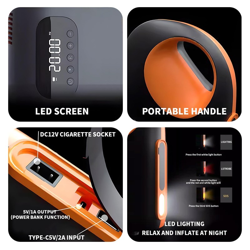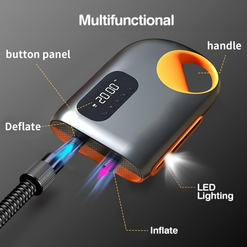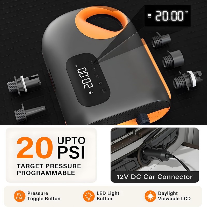 • [Smart Digital Air Pump - Precision Inflation Made Easy] This electric pump features a clear digital display for effortless inflation control: Real-time PSI monitoring Auto-stop at preset pressure Over-inflation protection Perfect for SUPs, inflatables, and outdoor gear. Simply set your desired pressure and let the pump do the work!
