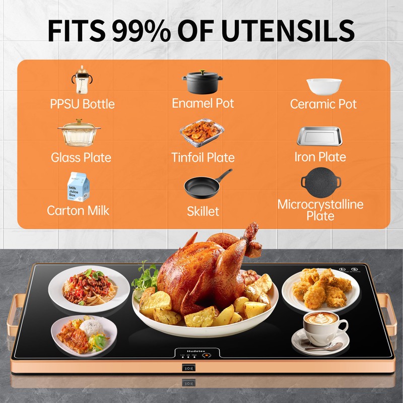 - Heat As You Like: 24”x16”, unique portable food waming mat with handle can keep 6 dishes warm(depending on the size of the dishes) at the same time. Using the Hudetex warming tray only requires 0.25kw/h, which saves electricity bills while providing warm and delicious food for family/friends.Besides This warming mat from Hudetex is made from unique heat-resistant tempered glass and gold rims, making it look even more unique and elegant. It is a good choice whether at a party or daily use.
