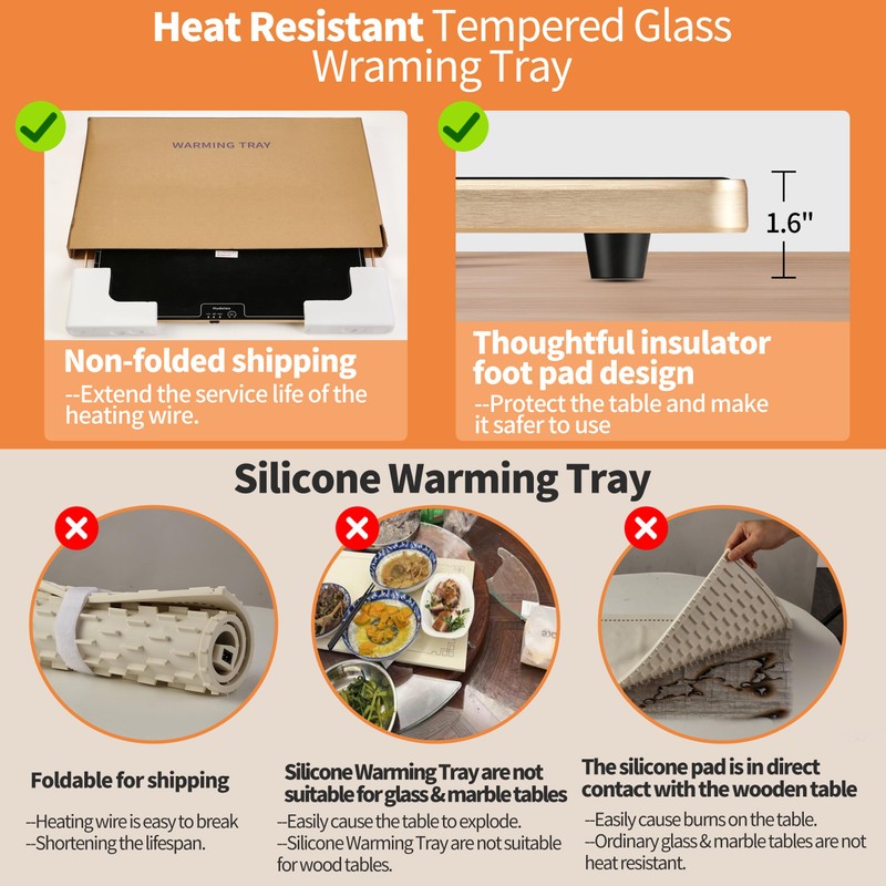 - Experience Even and Fast Heat Distribution: Full surface and large area heating, fast and even heating. Electric warming tray carefully designed the heating method of heating wire + heating film to ensure even heat distribution, allowing you to place the tableware freely.