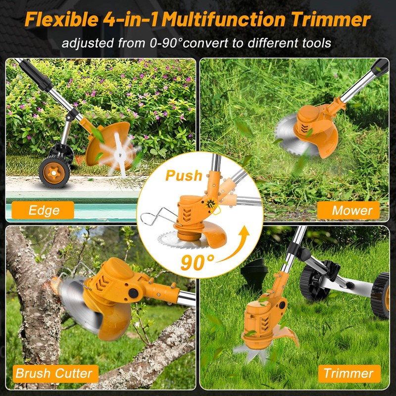 - 【2025 Newest Electric Weed Eater】The new upgraded 4-in-1 brush cutter/grass trimmer/string trimmer/mini lawn mower is equipped with 3 different cutting baldes and easy to assemble, It is also easy to convert from weed trimmer to wheeled string trimmer. The cordless weed eater battery powered equipped with 650W high-power motor, the speed of electric weed eater cordless can reach 8500 rpm, whether it is a bush/tough old grass that can be taken care of, making gardening tasks much simpler.