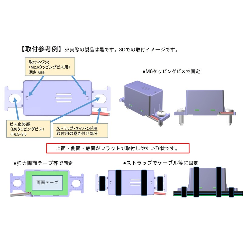 - Mounting points: hole for M6 screws on the side of the case, wrap around the strap, M2.6 screw holes on the top of the case, and the bottom of the case is secured with double-sided tape