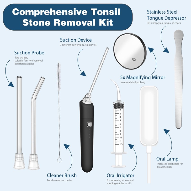 - 【Electronic Tonsil Stone Removal Kit】-- You will get an electronic tonsil stone remover, 2 suction probes, a 5x magnifying mirror, a stainless steel tongue depressor, an oral irrigator, a dental light, and a USB cable. Our vacuum offers a quick, comprehensive solution to tonsil stones, saving time and ensuring safety & gentleness. Great for use at home.
