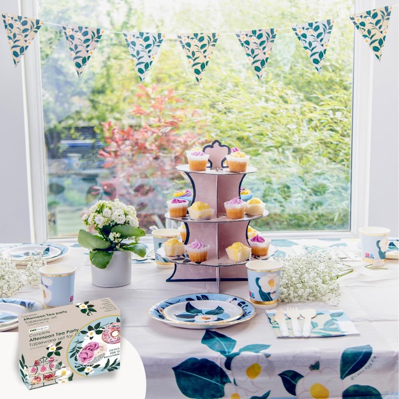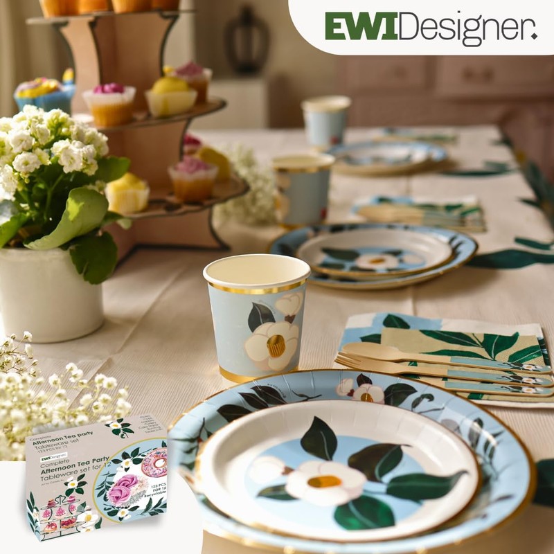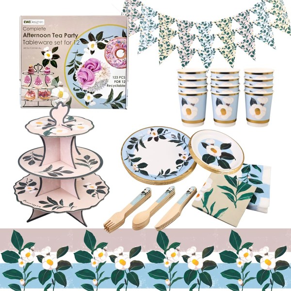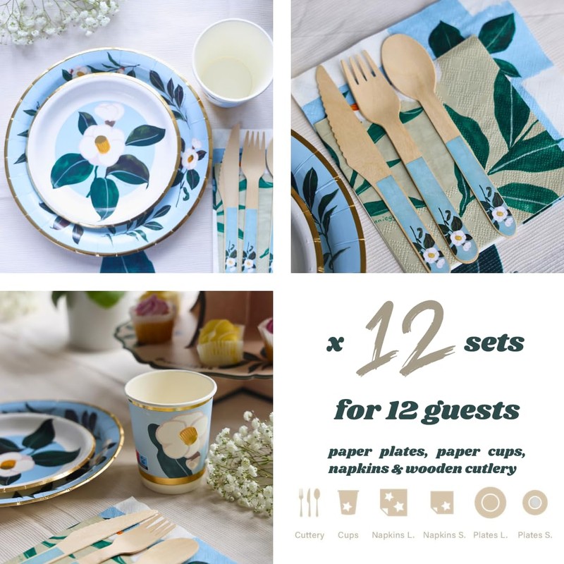 • Complete Pack: This all-inclusive set contains 123 pieces of Camellia-themed tableware, including 12 sets of wooden cutlery, elegant floral bunting, and a cupcake stand, perfect for special parties or leisurely weekend treats.