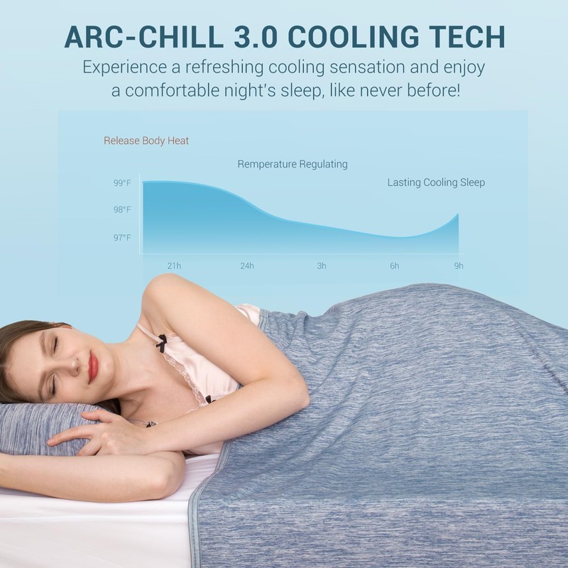 - DOUBLE-SIDED: One side of the cool blanket features the upgraded Arc-cill 3.0 cool fabric, which has the ability to rapidly absorb and dissipate heat (12X faster than cotton), providing an immediate cooling sensation upon contact. The other side is made of 100% natural Egyptian cotton, offering exceptional softness and excellent breathability. The two-sided design ensures year-round comfort.