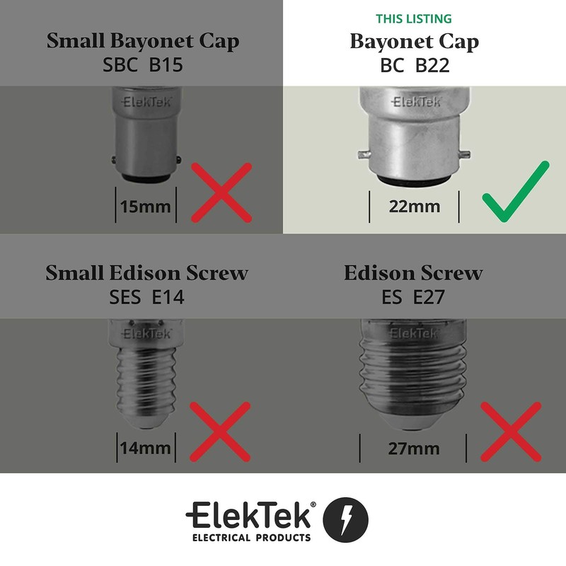 • Suitable for all types of B22 standard BC Bayonet Cap Bulb - Incandescent, LED, Halogen and CFL lamp bulbs up to 200W, T2 temperature rating (220°C)