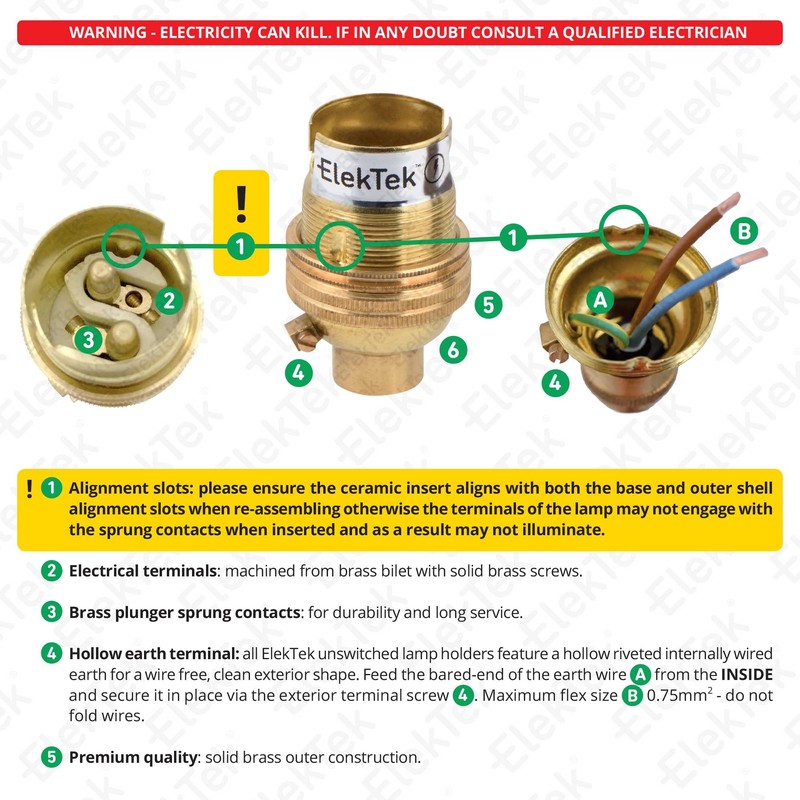 • Suitable for lighting circuits only, solid brass construction - features a hollow riveted EARTH terminal to allow the fitting to be earthed from the underside to keep a clean, wire free exterior aesthetic