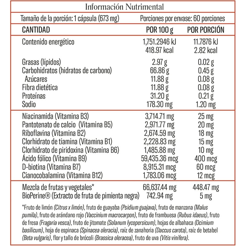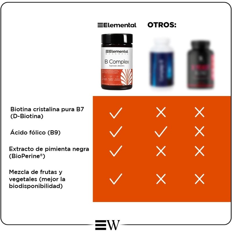 ¡Eleva tu energía y potencia tu salud diaria de manera natural! 🌟 Nuestro Complejo B Elemental combina todos los beneficios esenciales de las vitaminas B, frutas, verduras y BioPerine para ofrecerte una fórmula completa y altamente absorbible. 🍋🥦
